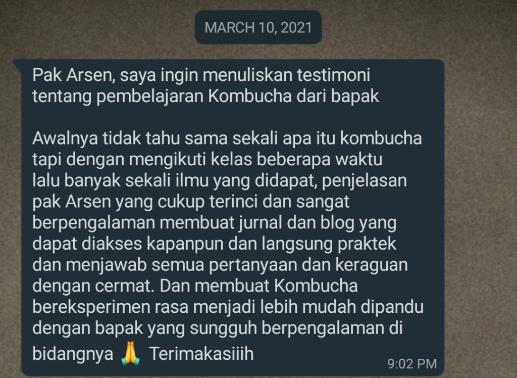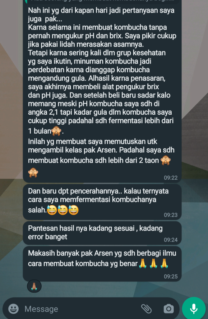 “Saya cukup beruntung melihat iklan Indokombucha di Instagram, dan kebetulan lagi saya baru memulai belajar merawat Kombucha Maret 2023, bahkan sempat membaca buku the Big Book of Kombucha β Hannah Crum juga. Sebelum memutuskan join kelas ini, saya ubek2 dulu websitenya pak Arsen malah π
